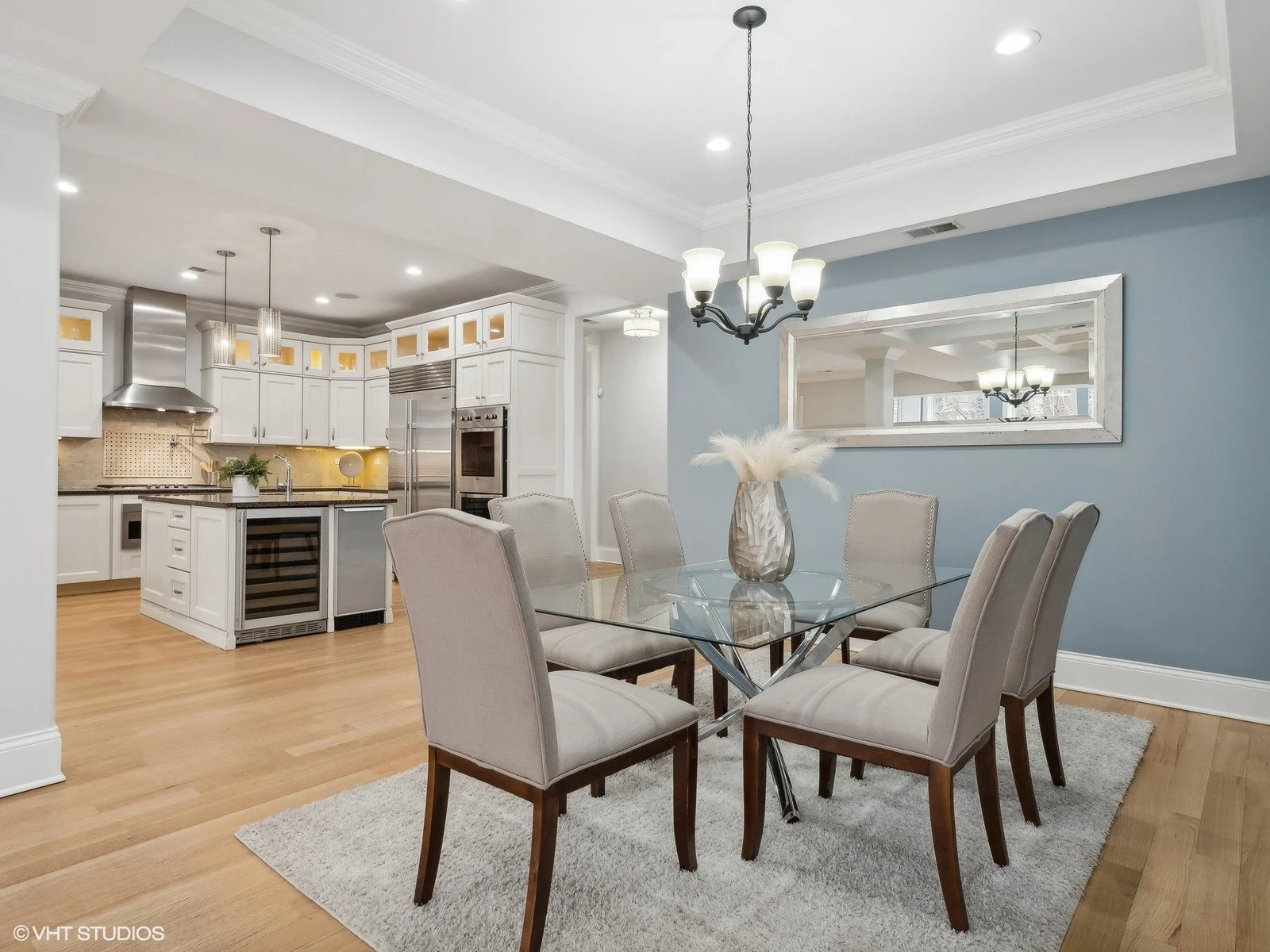 The heart of each home is the gourmet chef's kitchen, boasting endless countertop space, custom cabinetry, and a host of high-end appliances. Featuring luxurious amenities such as an expansive island, five-seater breakfast bar, a Sub-Zero fridge, Viking double oven, Wolf cooktop, two Bosch dishwashers, a wine fridge, ice maker, and two sinks, the kitchen layout is unparalleled in both form and function. The other half of the open main space is equally impressive, featuring an open concept encompassing a formal dining area, a living room adorned with an elegant fireplace and built-ins, and a sunlit sitting room perfect for relaxation. Bathed in natural light streaming through the southern-facing Pella windows, these units are accentuated by coffered ceilings and 10’ of height.